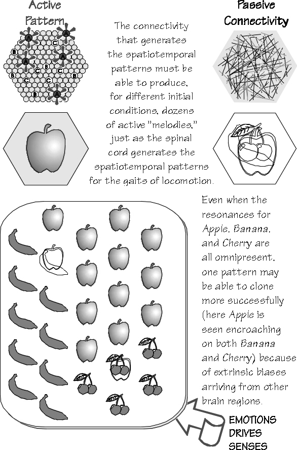 Nor have we been able to see those cell-assemblies that Donald Hebb imagined fifty years ago in The Organization of Behavior. We only invented the microelectrode techniques, needed to study one cortical neuron at a time, about forty years ago and it is still a feat to study a dozen individual neurons at the same time. The picture that I have painted here predicts much more detail about those subpatterns (my hexagonal spatiotemporal pattern is essentially a candidate for the minimal cell-assembly that has one of everything but no redundancy), yet it too is beyond the bounds of what the microelectrode and imaging technologies can currently deliver.