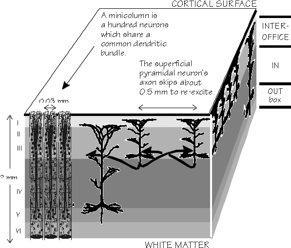 In particular, we need to know about the cerebral codes — those patterns that represent each of the words of our vocabulary, and so forth — and what creates them. At first, it appears that we are dealing with a four-dimensional pattern — the active neurons scattered through three-dimensional cortex, as they perform in time. But largely because the minicolumns seem to organize all the cortical layers around similar interests, most people working on cortex think of it as a two-dimensional sheet, rather like the retina (yes, the retina is 0.3 mm thick and is subdivided into a few layers, but the mapping is clearly for a two-dimensional image).