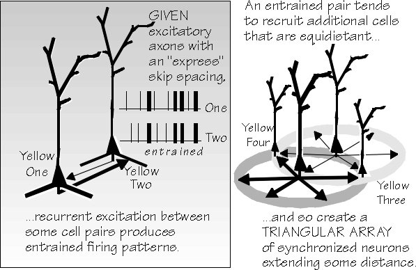 So it wouldn’t be surprising if Yellow One and Yellow Two, once they got their act in sync, managed to recruit a Yellow Four as well as a Yellow Three. And there are other neurons at the hot spot of the pair formed by One and Three: perhaps a Yellow Five will join the chorus, if it already has enough other inputs to put the paired inputs within range of its threshold. As you can see, there is a tendency to form a triangular array of often-synchronized neurons that could extend for a few millimeters across the cortical surface.