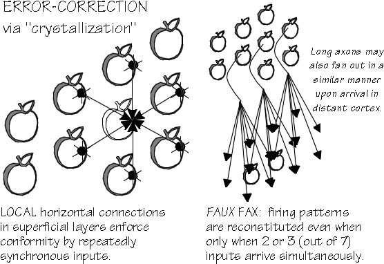 Because one neuron can become surrounded by six others, all telling it to fire at a certain time, we have error correction: even if a neuron tries to do something different, it is forced back to the choral pattern that has become established by its insistent neighbors. That is essentially an error-correction procedure, just what the faux fax needs — if only the long corticocortical axon terminals did what the local ones do: fan out into patches about 0.5 mm apart rather than ending in a point.