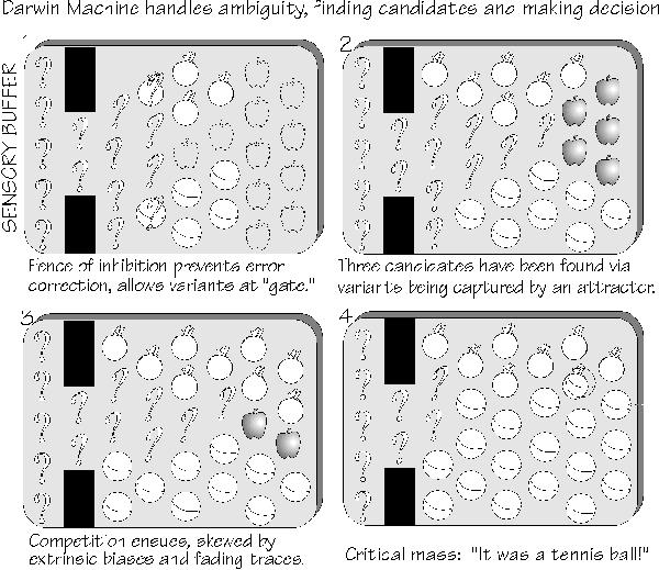 So, is a sentence simply one big spatiotemporal pattern, cloning away in competition with other sentence codes? Not necessarily. We don’t require copying competitions in order to make a decision; simple rating schemes ought to suffice, if nothing particularly new is involved. Recall the cormorant of chapter 2: rating schemes will do for its decision making, because the choices (swim, dive, dry wings, fly away, look around a little longer) are already well-shaped by evolution over the generations. Copyable schemas aren’t everything, once you get close enough to standard meanings.