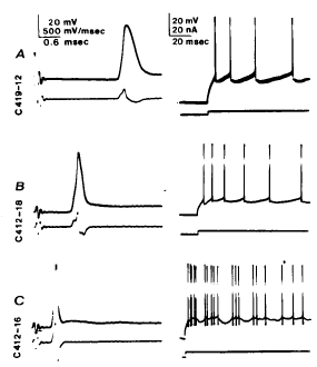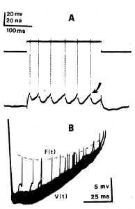 Calvin, W. H. (1974). Three modes of repetitive firing and the role of threshold time course between spikes. Brain Research 69:341-346. Available at WilliamCalvin.com/1970s/1974BrainRes.pdf - Can be viewed and printed in PDF format When rhythmic firing is elicited in cat spinal motoneurons by long-lasting depolarizing currents, the `threshold' voltage from which each spike arises may appear to be quite constant (Fig. IA, arrow). If one probes for the threshold during the interspike interval (ISI), however, it is seen to fall well below this level, rising towards it later in the ISL Exceptionally large depolarizing afterpotentials may intersect this threshold time course shortly after a spike, causing an extra spike. The extra spike itself may also similarly produce another extra spike; thus a regenerative cycle may produce a burst of spikes at a high firing rate.  |