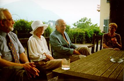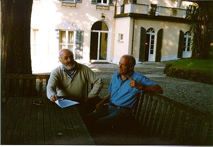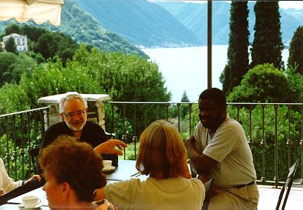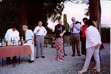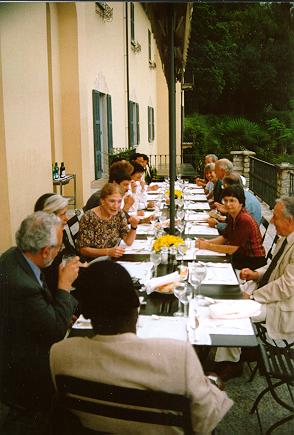Derek Bickerton and I decided to aim our book on the evolution of syntax at exactly the sorts of people we were talking with at Bellagio (serious readers, but not necessarily scientists; see the list). It will be published as Lingua ex machina: Reconciling Darwin and Chomsky with the Human Brain in 1999 by MIT Press. And to give you an idea of what this audience spanned, among the people pictured hereabouts are a novelist, a historian of the ancient Greek novel, a musicologist, a composer, several painters, a literary pathologist, a linguist, two neurophysiologists, an engineer, a plant geneticist, and several professors of media studies. And some of those labeled "US" came from Uruguay, Mexico, or the UK.