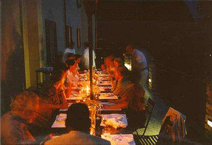 Here's a typical dinner scene, with most of the "residents." When there was a short conference also going on, we ate with them (and usually indoors, where there was more room).