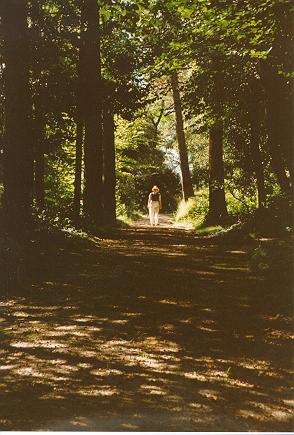The hill above the Villa is forested with many gravel paths wandering throughout, with lots of statues, grottos, and even park benches. Here's Katherine walking up the path toward the "Castle."