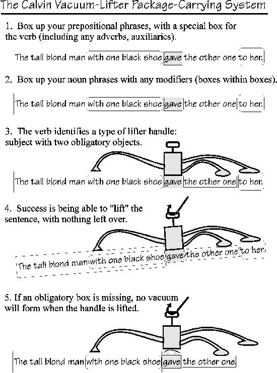 for understanding sentences will also seem contrived. Im going to propose how one such lingua ex machina could work, combining phrase structure and argument structure in an algorithmic way. Linguists will probably find it at least as contrived as other diagraming systems. But heres a few paragraphs worth of Calvins Vacuum-Lifter Package-Carrying System, involving processes as simple as those of a shipping department or production line.
