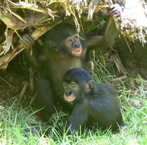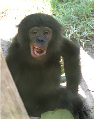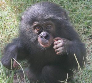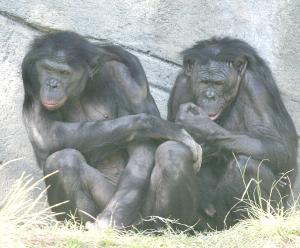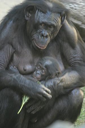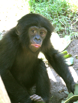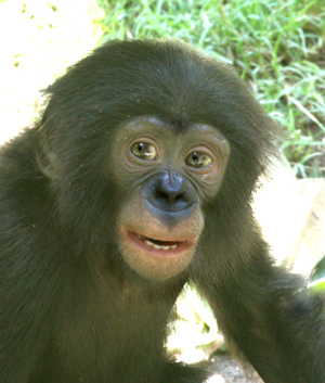 Next we come to the bonobo (formerly known as the pygmy chimpanzee, not because they are small -- they are not -- but because they live near the Pygmy people of the Congo Basin, who are known for their small stature). Bonobos are "the chimps of the Pygmies." Note the glaring error on the UN map of Africa below where, trying to avoid the word "pygmy," they coin the phrase "dwarf chimpanzees." Alas. If anthropologists and primatologists had to select one great ape which was behaviorally closest to humans, it would likely be the bonobo because of similarity in both social and sexual behaviors. We are, however, more like the common chimpanzees in other respects, such as practicing "gang warfare" on neighbors.