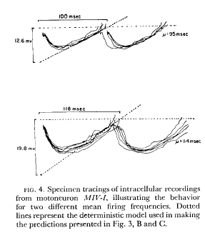 Calvin, W. H., and Stevens, C. F. (1967). Synaptic noise as a source of variability in the interval between action potentials. Science 155:842-844. Available at http://WilliamCalvin.com/1960s/1967Science.pdf Abstract. The source of variability in the interval between action potentials has been identified in a class of cat spinal motoneurons. The observed random fluctuations in membrane potential (synaptic noise) together with an empirical description of spike generation accurately predict the statistical structure of variability observed to occur in the neuron's discharge.