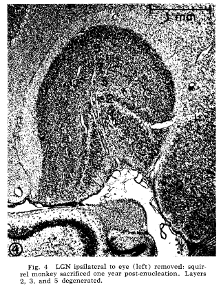 Doty, R. W., Glickstein, M., Calvin, W. H. (1966). Lamination in the lateral geniculate nucleus in the squirrel monkey, Saimiri sciureus. Journal of Comparative Neurology 127:335-340. Available at http://WilliamCalvin.com/1960s/1966JCN.pdf ABSTRACT The parvocellular portion of the lateral geniculate nucleus (LGN) in the squirrel monkey (Saimiri sciureus) is a relatively unlaminated mass of cells. In order to determine whether a concealed laminar structure might exist, one eye was removed in each of three squirrel monkeys. Transneuronal degeneration did not appear prominent in the LGN of the animal which was allowed to survive for six months, but in the two animals which survived for one year six laminae were clearly present. There was transneuronal degeneration in layers 1, 4 and 6 contralateral to the enucleation, and 2, 3 and 5 ipsilaterally. Lack of interlaminar fiber masses probably accounts for the apparent absence of lamination in the normal parvocellular mass.