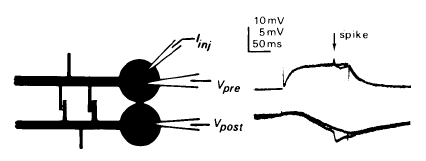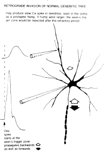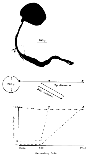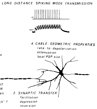 WilliamCalvin.com/1970s/1979PresynapticDendrites.pdf voltage. In a number of invertebrate spikeless and spiking neurons, synaptic transmission lasts for the duration of the presynaptic depolarization. There is a threshold presynaptic voltage, but it is sometimes below the spike threshold, or even below the resting potential. Above the release threshold, the postsynaptic potential (PSP) grades over a wide range of presynaptic voltages. The steady-state cable equation can be used to predict how PSPs spread within a complex dendritic geometry. Input synapses located on long, thin processes develop large PSPs, although these PSPs attenuate markedly before reaching central structures. Whereas a proximal dendrodendritic output synapse would see proximal and distal input synapses as approximately equal, a distal output synapse would see many-fold differences in the relative PSP sizes. Thus regional computations could take place in distal dendritic trees ; a given neuron could compute many different functions of' its inputs. Models are made of Aplysia and lobster neurons, of a cat spinal motoneuron, and of a neuron in the rat superior colliculus. ![]() |