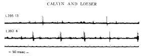 Calvin, W. H., and Sypert, G. W. (1976). Fast and slow pyramidal tract neurons: An intracellular analysis of their contrasting repetitive firing properties in the cat. Journal of Neurophysiology 39:420-434. Available at WilliamCalvin.com/1970s/1976JNeurophysiol.pdf Can be viewed and printed in PDF format SUMMARY AND CONCLUSIONS1. Intracellular recordings were made from an estimated 500 neurons in the sensorimotor cortex of barbiturate-anesthetized cats. Of those which were antidromically identified from the medullary pyramids, 70 were selected which also exhibited steady repetitive firing to steps of current injected through the recording electrode; 81% were "fast" (conduction velocity greater than 20 m/s) and 19% were "slow." 2. As shown by earlier workers, the spike duration is a function of conduction velocity ; a spike duration of 1.0 ms is the dividing line between fast and slow. 3. Of the 57 fast pyramidal tract neurons (PTNs), 14 exhibited double spikes during otherwise rhythmic firing patterns to a step of injected current. These very short interspike intervals (usually 1.5-2.5 ms) were first seen interspersed in a rhythmic discharge (e.g., 50-ms intervals) but, with further increases in current strength, would come to dominate the firing pattern ; e.g., double spikes every 40 ms. Further increases in current would typically shorten only the long intervals ; e.g., 40-30 ms, but some fast PTNs developed triple spikes, etc. 4. The extra spike appears to arise from a large hump which follows most spikes in fast PTNs; while this humplike "depolarizing afterpotential" can also be seen in slow PTNs, it is small. Extra spikes were seen only in fast PTNs with large postspike humps ; in perhaps half of the fast PTNs, extra spikes probably contributed to "adaptation." 5. Slow PTNs often had frequency-current curves which were not repeatable ; a "hysteresis" phenomenon could often be seen, where the proportionality constant relating current to firing rate decreased following high firing rates. 6. The B spike was distinguishable from the A spike in differentiated antidromic spikes in 77% of the slow PTNs, in only 14% of the fast PTNs which later exhibited double spikes during current-induced repetitive firing, and in 53% of the other fast PTNs. 7. The antidromic spike heights of doublet PTNs were not significantly different from those of other repetitively firing PTNs. |
