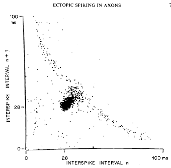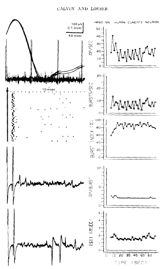 Calvin, W. H., and Loeser, J. D. (1975). Doublet and burst firing patterns within the dorsal column nuclei of cat and man. Experimental Neurology 48:406-426. Available at WilliamCalvin.com/1970s/1975ExpNeurol.pdf - Can be viewed and printed in PDF format in two parts: Part 1 Part 2 We have examined extracellularly the firing pattern of neurons in the cat external cuneate nucleus and in the human main cuneate nucleus, focusing upon both the spontaneous firing patterns and its modification by natural stimulation. Many of these neurons exhibit stereotyped doublet or burst firing patterns, e.g., the interval between the spikes might be 1 .0 + 0 .1 msec in a given cell . For most cells, this characteristic doublet interval was between 0.8 and 2.0 msec, with a few extending to 5 msec . While doublets were most common, the number of spikes per burst ranged to six or more . When the external cuneate neurons were synaptically driven by forelimb position changes, the firing rate increased but the proportion of spikes occurring within bursts (the "burst index") often fell . The doublets that occurred became broader during synaptic drive. This paradoxical behavior (the peak instantaneous firing rate falling as the average firing rate rises) is analogous to the doublet firing patterns occasionally observed in spinal motoneurons ; there, the doublet is caused by a large depolarizing afterpotential (postspike hump) which rises through the falling threshold at the end of the relative refractory period to elicit an "extra spike ."